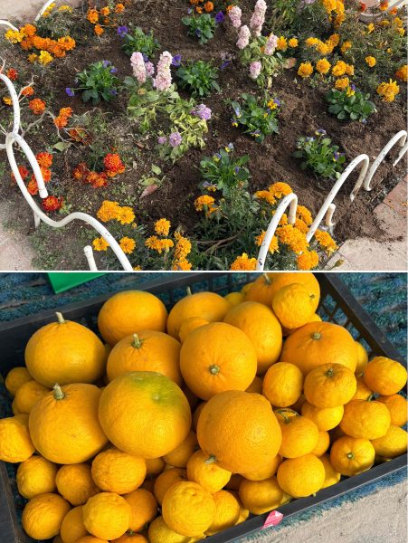 新年に向けて、中央昇降口前の四角花壇の植え替えを行うつもりでしたが、マリーゴールドがまだ咲いているので、隙間にビオラを植え足しました。