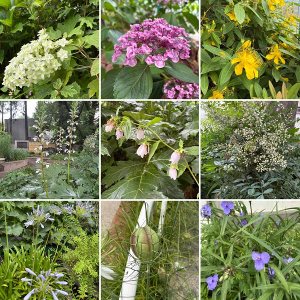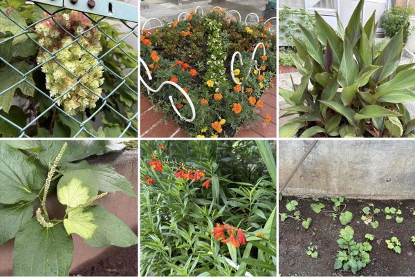 夏休みに入りました。校庭では葉が生い茂り、花は少なくなりましたが、この季節ならではの植物をご紹介します。(写真左上から右へ) カシワバアジサイ: 花のピークは過ぎましたが、花の終わりと共に房の元から赤から緑、白とグラデーションになっている姿もまた美しいと思いませんか?