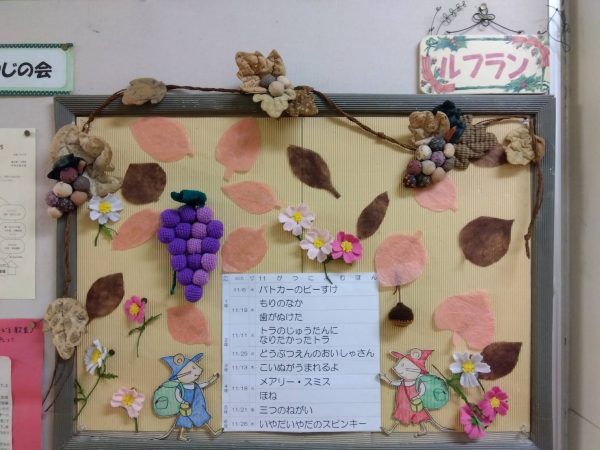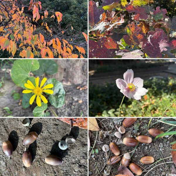 校庭では桜の葉が赤く染まり、セコイヤのオレンジ色が空へまっすぐ伸びるようにそびえています。また、秋は実りの季節です。もう終わってしまったものもありますが、ナンテンの赤い実やジュズダマ、どんぐり、すぎぼっくり、ギンナン、ムクロジ、ヤブラン、オシロイバナなど、様々な実が見られます。