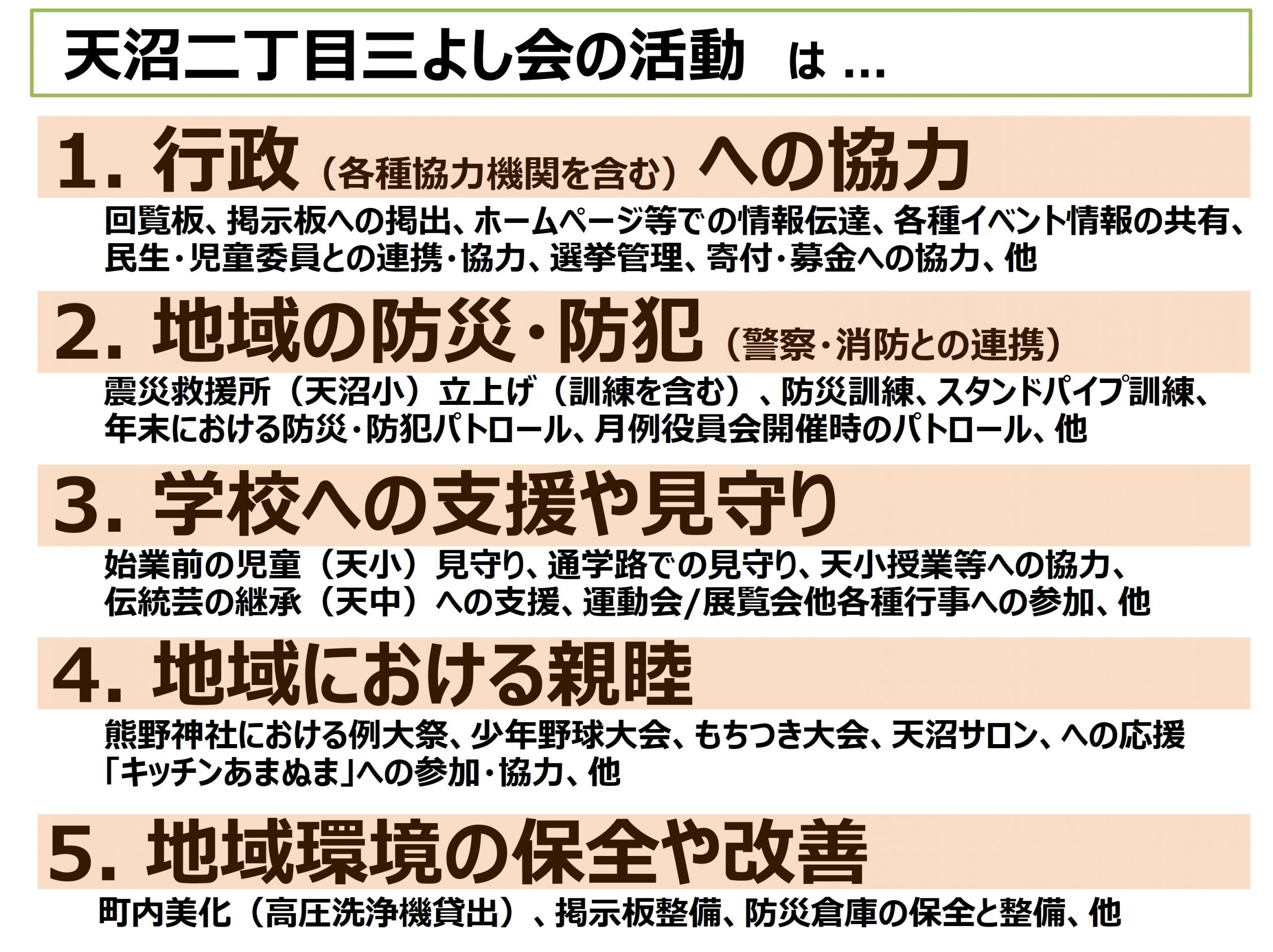 天沼二丁目三よし会として、昨年度も皆様より活発なご意見をいただいた年次総会に始まり、大いに盛り上がった熊野神社の例大祭や地域のお祭り「あまぬまみんなのフェスタ」、また地域の防災活動としてスタンドパイプ訓練や震災救援所立上げ訓練を実施し、多くの皆様の参加を頂きました。加えて地域の子どもたちを支える少年野球大会、天沼児童館でのもちつき大会にも参加、また地域にとってのデジタル化を考える講演会を実施するなど、それらの活発な活動を通して「明るい、仲良い、暮らしよい」町会の維持・促進ができたものと思っております。