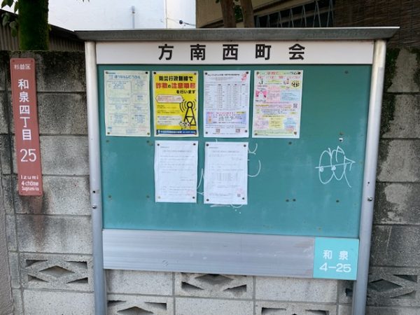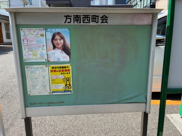 方南西町会には16ヶ所掲示板があり、回覧等お知らせを掲示しています。