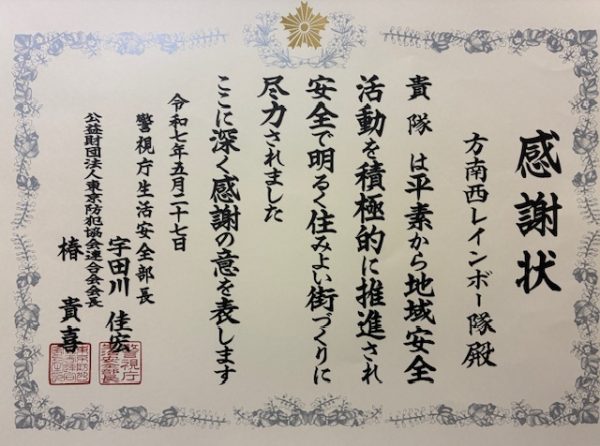 感謝状をいただきました 方南西町会は「方南西レインボー隊」として毎月第1土曜日に町会内で防犯パトロールを実施しています。その活動に対し、警視庁生活安全部長、公益財団法人東京防犯協会連合会会長より連名の感謝状をいただきました。今後も防犯パトロールを続けていきます。] FacebookXHatenaPocketCopy 2025年9月7日方南西町会は「方南西レインボー隊」として毎月第1土曜日に町会内で防犯パトロールを実施しています。その活動に対し、警視庁生活安全部長、公益財団法人東京防犯協会連合会会長より連名の感謝状をいただきました。今後も防犯パトロールを続けていきます。
