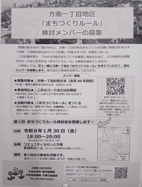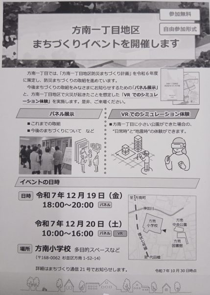 方南1丁目地区まちづくりイベント 12月19日と20日に方南小学校を会場として方南1丁目地区の防災などについて住民で考えるイベントが開催されます.また1月30日は会場を変えてまちづくりルール検討会も開催されます. 方南一丁目地区防災まちづくり計画(杉並区ホームページ) FacebookXHatenaPocketCopy 2025年11月9日12月19日と20日に方南小学校を会場として方南1丁目地区の防災などについて住民で考えるイベントが開催されます.また1月30日は会場を変えてまちづくりルール検討会も開催されます.