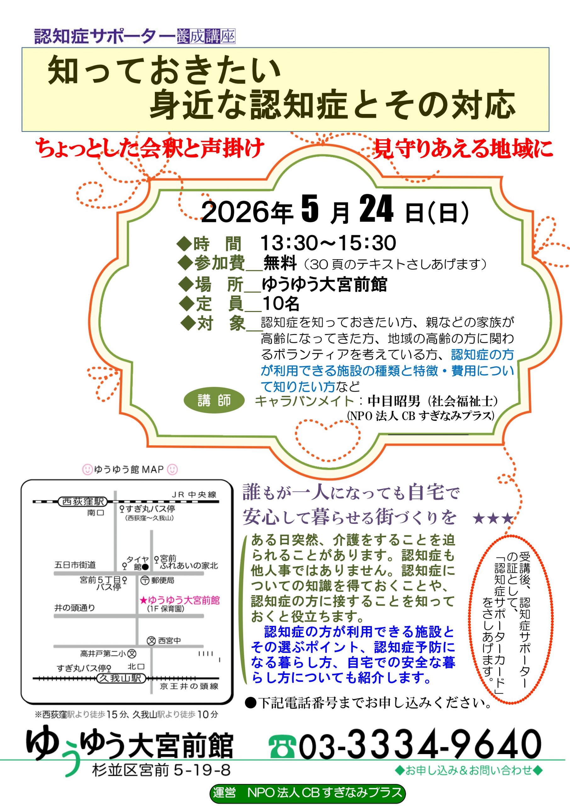 「認知症サポーター養成講座」、受講者募集中! 開催日:2026年05月24日(午後1時30分~)ゆうゆう大宮前館では、5月24日に「認知症サポーター養成講座」を開催します。 ただいま受講者を募集中です。 (開催要領) 1.講座の≫続きを読む料金:無料/会場:ゆうゆう大宮前館(杉並区宮前5-19-8)/種別:講座/対象:どなたでも/記事掲載日:2026年04月02日