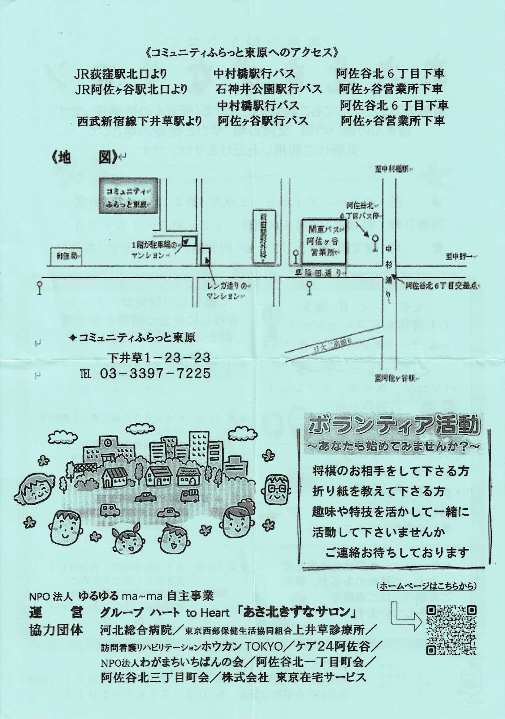 (※チラシを拡大するには、下記の青文字部分【続きを読む】をクリックして、下方向へスクロールしてください。)グループハート to Heart」の活動のひとつ「あさ北きずなサロン」は、 毎月第1・第3水曜13:00~15:30に開催しています。 わがまち一番体操、暮らしの情報コーナー、各種趣味のコーナー(パソコン、編み物、折り紙、他)、集いの場、などがあります。 皆さんのご参加をお待ちしております。
