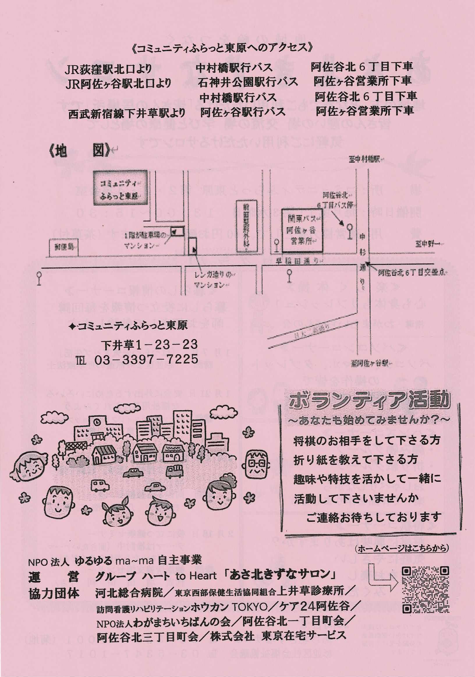 (※チラシを拡大するには、下記の青文字部分【続きを読む】をクリックして、下方向へスクロールしてください。)グループハート to Heart」の活動のひとつ「あさ北きずなサロン」は、 毎月第1・第3水曜13:00~15:30に開催しています。 わがまち一番体操、暮らしの情報コーナー、各種趣味のコーナー(パソコン、編み物、折り紙、他)、集いの場、などがあります。 皆さんのご参加をお待ちしております。
