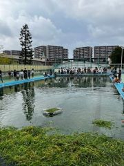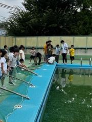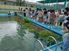 雨予報でしたがお天気もなんとかもち、プールに筏を設置することができました。筏が来年まで壊れないように、本結び、巻き結びを学び竹とネットをしっかりと結びました。来年もたくさんのヤゴを救えるように皆んな真剣に取り組みました。