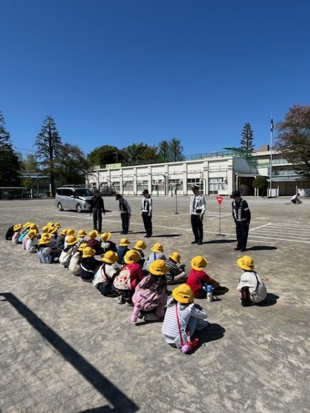 警察の方5名に来ていただき、校庭に横断歩道を設置し、渡る時の注意点を丁寧に説明していただきました。