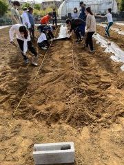 八成ファームボランティア、先生方、学校支援本部で畝作りを行いました。