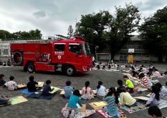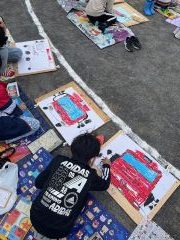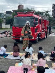 東京消防庁の消防車に来ていただき、校庭で写生会を行いました。消防車の細かいところまで観察し、丁寧に描いていました。