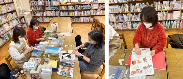 1月20日(火)12:25〜 本の森のガイドさん(保護者ボランティアさん)3名がももし図書館(2階図書室)で本の修理、ラベルの貼り替えをしてくださっていました。