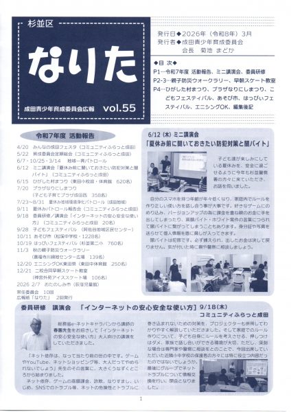 お待たせいたしました。広報なりたvol.55を発行しました。1年間の成田青少年育成委員会の活動が載っています。どうぞご覧ください。