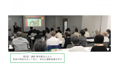 今回の研修会では、会の成り立ちや大切にしている想いを改めて確認するとともに、実践の現場で生じる「困りごと」への対応や、身体のしくみに基づいた安全な体操指導について学び、今後の活動の質の向上を目指しました。