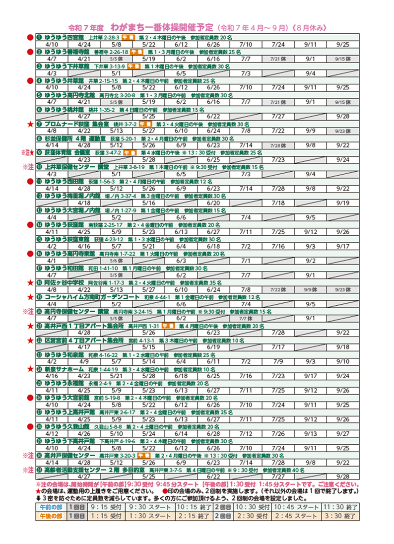 令和7年10月~令和8年3月後期【わがまち一番体操】開催のお知らせのご案内です。プログラムは、★準備体操★筋力アップ体操★口腔体操★整理体操,を実施。地域のゆうゆう館、杉並保健所、高井戸保健センター、荻窪体育館などで行っています。どなたでも気軽に参加できる交流の場です。参加は無料ですが飲み物持参でお出かけください。