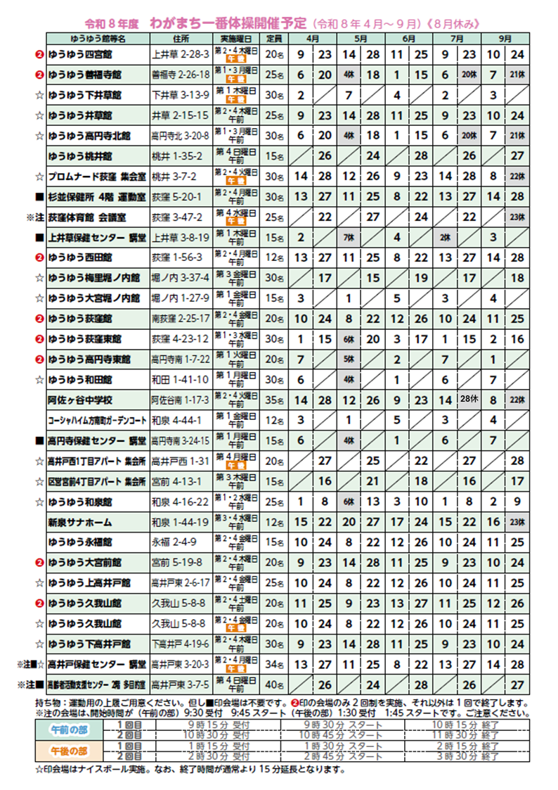 令和8年4月~9月前期【わがまち一番体操】開催のお知らせのご案内です。プログラムは、★準備体操★ナイスボール体操★筋力アップ体操★口腔体操★整理体操,を実施。地域のゆうゆう館、杉並保健所、高井戸保健センター、荻窪体育館などで行っています。どなたでも気軽に参加できる交流の場です。参加は無料ですが飲み物持参でお出かけください。