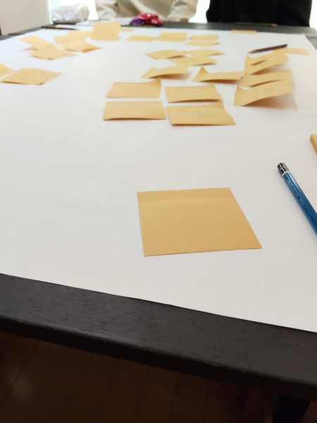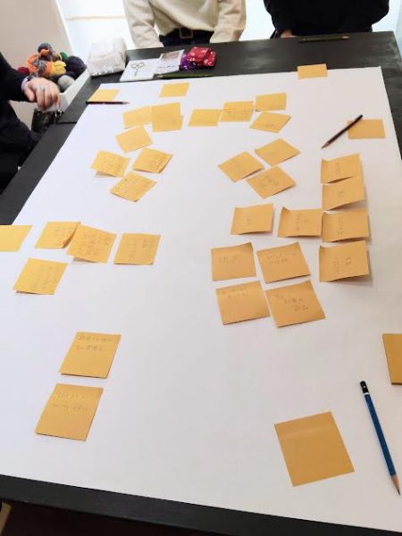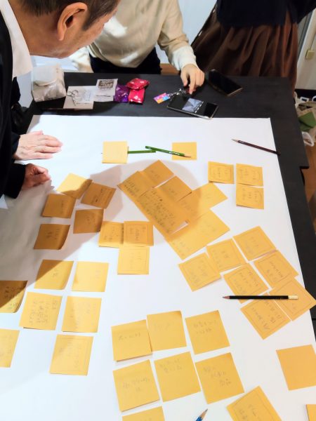 この日は参加者がアート作品への参加(編み物など)をしながら、アートやご自身についてのお話をする会と、子どものころに戻って、自分が最初に触れたアートについて付箋に書きだし、そのアートについて当時の気持ちを思い出しながら語り合うワークに参加させていただきました。