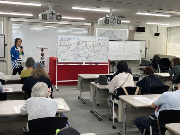 ミニ講座「15秒で言える男女共同参画」では、ホワイトボードに男女共同参画の目的・目標・手段が穴埋め問題のように書かれており、穴の空いた部分を皆に問いかけ、埋めていきながら講義をしました。性差別をなくし人権を実現することや、性別による役割を押し付けないこと=ジェンダー・ハラスメントを無くすことについて、わかりやすく解説いただきました。