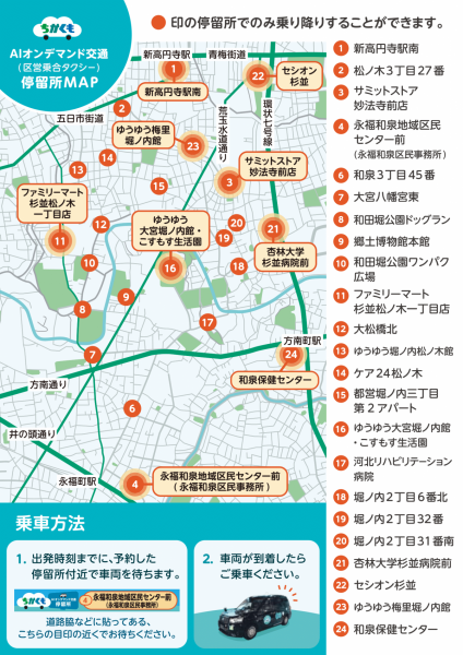 杉並区では、交通不便地域において、主に高齢者や障害者、子育て世帯など移動をためらう区民を対象に、お出掛けを促すことを目的とし、2025年1月8日(水曜日)からAIオンデマンド交通の実証運行を実施しています。