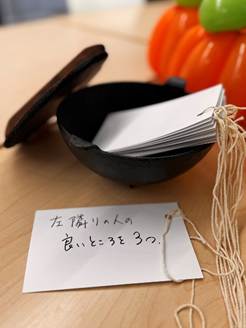 闇鍋のお題は、「実は〇〇です」「最近発見したもの、こと」「熱中していること」「気になっている流行りのもの」「左隣の人の良いところを3つ」「向かいの人との共通点3つ」「最近、楽しかったこと」「やってみたいこと」など、何が出るかワクワクドキドキしながら紙を引いて和気あいあいと話をする姿をみて、この遊び心たっぷりの仕掛けに良い手ごたえを感じ、話が弾む様子に嬉しくなりました。