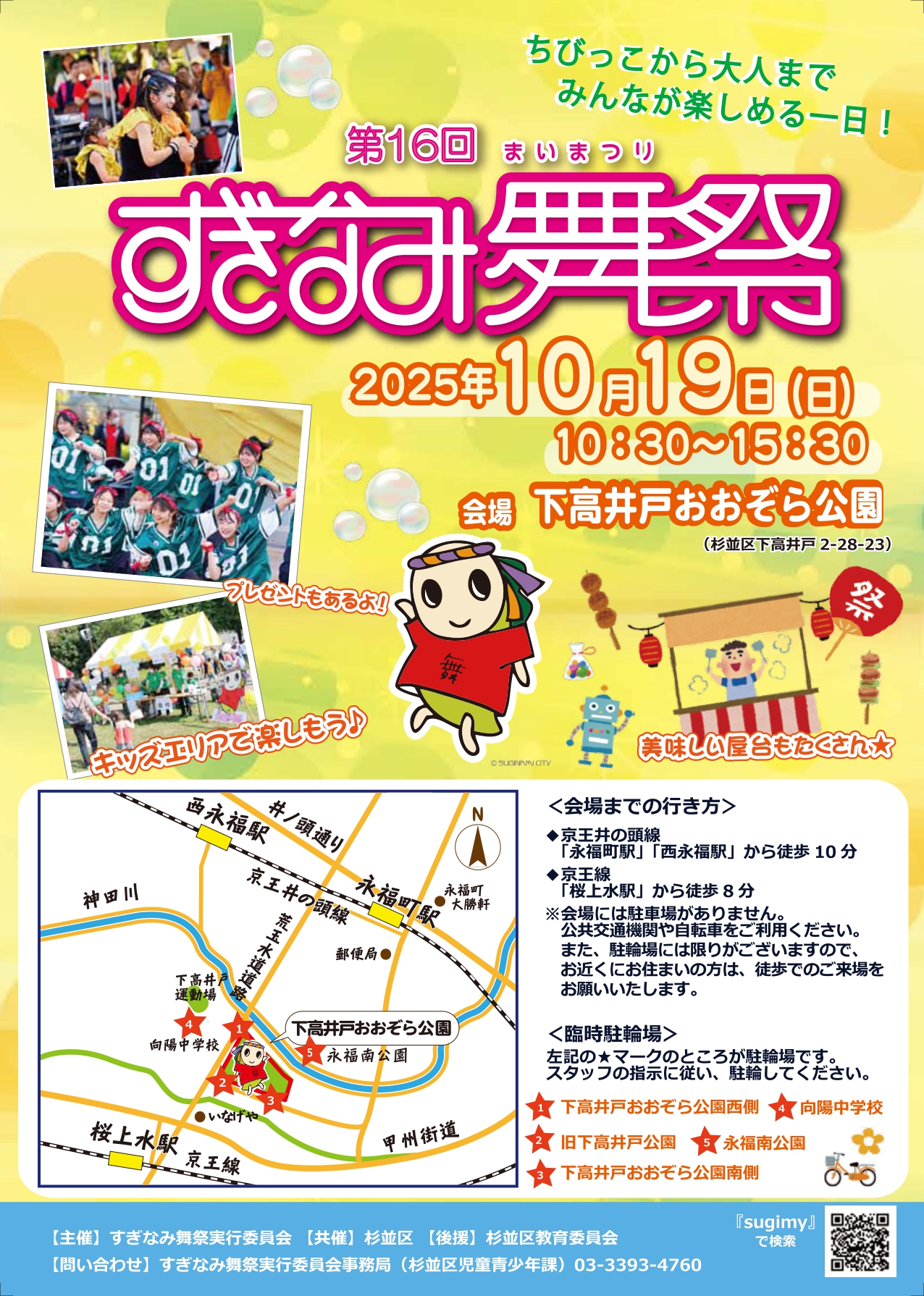 ≫続きを読む令和7年10月19日(日)下高井戸おおぞら公園にて、第16回すぎなみ舞祭を開催しました。ダンスステージでは、楽しく踊りキラキラと笑顔輝く子どもたちの姿を見ることができ、また、ご協力をいただいた皆さまお力添えにより、企画し … “ご来場ありがとうございました♪” の続きを読む