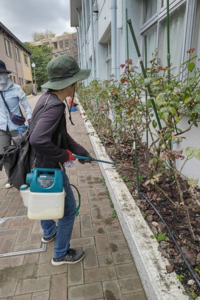 *この時期、害虫、黒点病による葉の減少を防ぐ為、活力剤と交互に散布している。