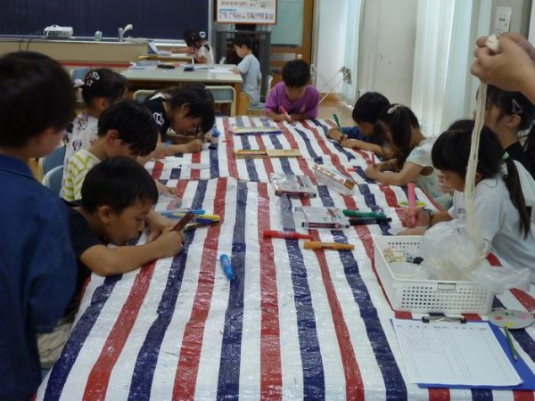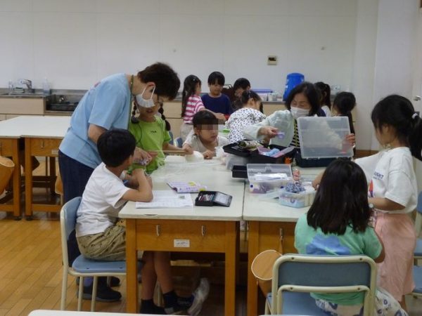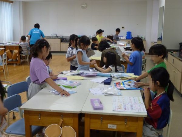 手芸コーナーの様子です。初めての子どもでも2名の専任スタッフの指導ですぐに小作品を完成できます。中にはずっと手芸コーナーに座ったままの子どもも珍しくありません。時々、男の子の参加もあります。
