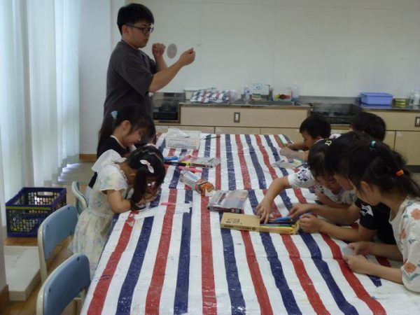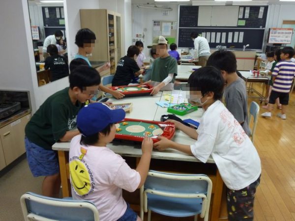 児童館の出前工作はお馴染みの「ぶんぶんゴマ」です。一年生も幼稚園や保育園で作ったことがあるようで、とても上手に絵を描いて手際よく完成させました。回すのは少し苦労した子供もいましたが、みんな楽しそうに遊んでいました。