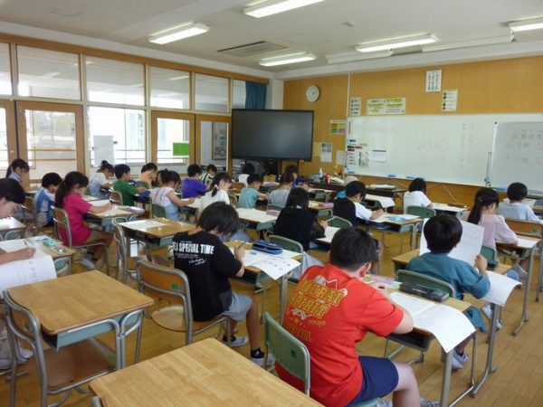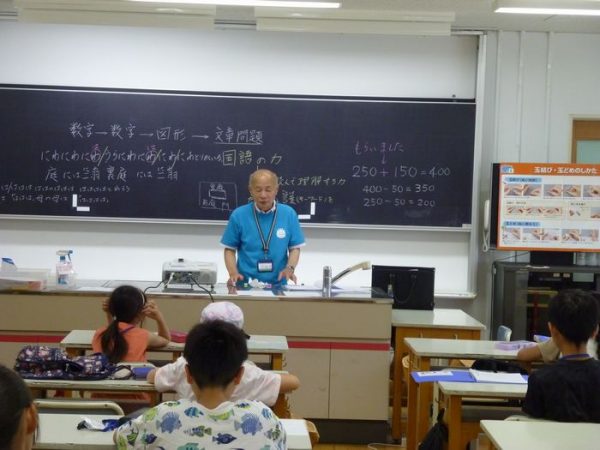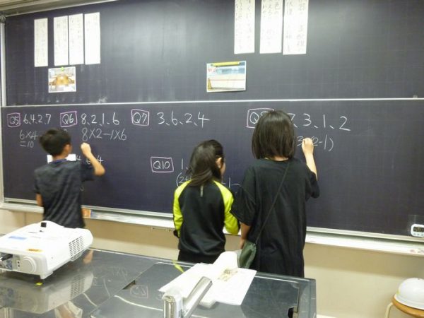 0から9までの数字4つと+、-、×、÷、( )を使って合計10を作る「テンパズル」に挑戦しました。最初はなかなか要領がわかりませんでしたが、だんだんと興味がわいてきて、後半は先を争って黒板に自分で考えた正解を書いてくれました。三年生も高い正解率でした。今年の三年生は頑張っています。