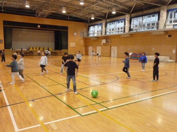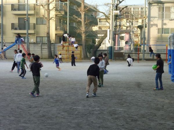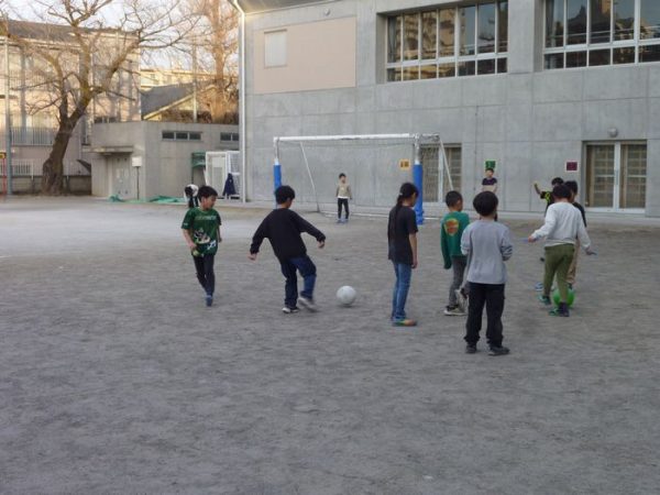 二学期の終わり頃と比べると日の入りがずいぶんと遅くなりました。今日は風も弱く、この時期としては気温も高めで絶好の外遊び日和です。一番の人気はやはりサッカーのようでした。