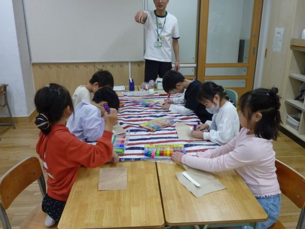 そろそろハロウィーンが近づいてきました。工作コーナーにはハロウィーン仕様の紙皿と紙コップが登場し、早速女の子たちがオリジナルの素敵な飾りを作っていました。