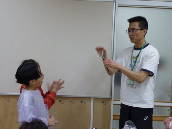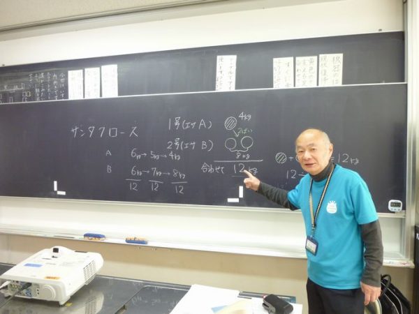 昔懐かしい(思い出したくもない?!)「つるかめ算」です。いきなりオーソドックスな解放を教えるのではなく、まずは子どもたち一人ひとりに鶴と亀の絵を描いてもらい、代表数名に黒板に傑作を発表してもらいました。続いて簡単な問題を使ってトライ・アンドエラー方式で解く方法を学びました。次は少し複雑な問題で、トライ・アンドエラー方式だと時間がかかるので、鶴(または亀)が一匹増えると足の数がどのように増減するかの規則性に気付いてもらって正解にたどりつきました。途中で「なぜ鶴と亀なの?」と突っ込みを入れて、子どもたちから様々なアイデアが出され、中には「ムカデとダンゴ虫」と言うあまり解く気にならない組み合わせもありました。とても賑やかな「おもしろ算数」になりました。