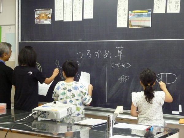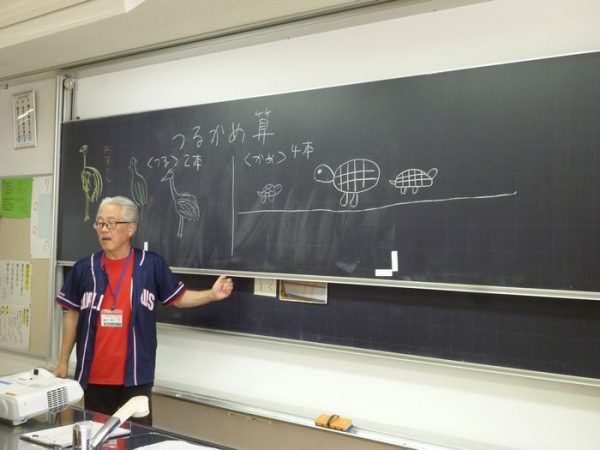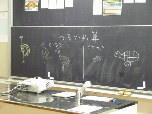 昔懐かしい(思い出したくもない?!)「つるかめ算」です。いきなりオーソドックスな解放を教えるのではなく、まずは子どもたち一人ひとりに鶴と亀の絵を描いてもらい、代表数名に黒板に傑作を発表してもらいました。続いて簡単な問題を使ってトライ・アンドエラー方式で解く方法を学びました。次は少し複雑な問題で、トライ・アンドエラー方式だと時間がかかるので、鶴(または亀)が一匹増えると足の数がどのように増減するかの規則性に気付いてもらって正解にたどりつきました。途中で「なぜ鶴と亀なの?」と突っ込みを入れて、子どもたちから様々なアイデアが出され、中には「ムカデとダンゴ虫」と言うあまり解く気にならない組み合わせもありました。とても賑やかな「おもしろ算数」になりました。