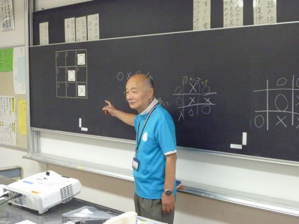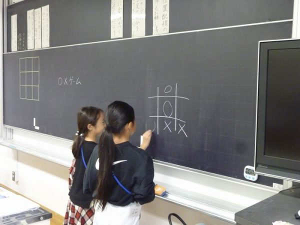 子どもの頃に誰でも一度はやったことがある「〇✖ゲーム」がテーマです。まずは代表2組に黒板で対戦してもらいました。次に、〇✖ゲームでは『引き分け』に終わるケースが多いことを納得してもらい、なぜ引き分けに終わることが多いのかを「算数の世界から(論理的に)」考えてみました。計算上は3マス×3マスの〇✖ゲームには17万弱通りの手順が可能ですが、人間の脳はその中から一瞬にして「負けない」つまり『引き分け』に持ち込む手順を発見していることを順を追って学びました。最後は二人一組で5マス×5マスの〇✖ゲームを楽しみました。