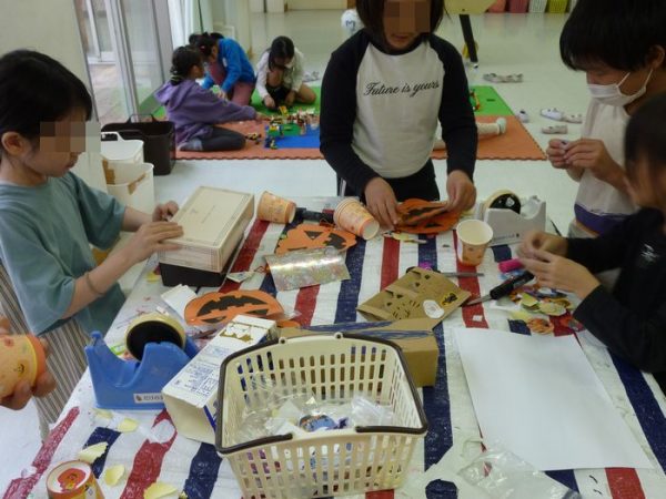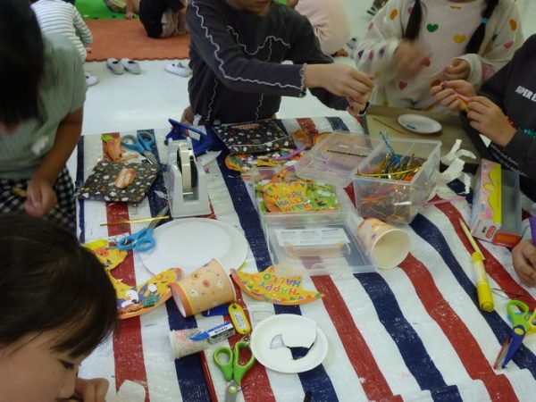 そろそろハロウィーンが近づいてきました。工作コーナーにはハロウィーン仕様の紙皿と紙コップが登場し、早速女の子たちがオリジナルの素敵な飾りを作っていました。