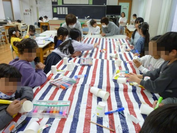 児童館の出前工作は「紙コップロケット」です。二つの紙コップの間に輪ゴムを十文字にかけて重ねると、ウサギやロケットの絵を描いた紙コップがピョンと飛び上がります。